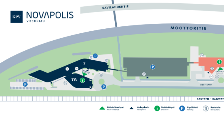 Hoitolamme sijaitsee KPY Novapoliksen tornitalossa ihan Viestikadun päässä. Sisäänkäynti on A-aulasta (alla olevassa kartassa vihreä nuoli) ja tarvittaessa saat opastusta aulapalvelusta. Pääovi on lukossa illalla arkisin klo 16 jälkeen sekä viikonloppuisin, jolloin pääovi aukeaa ovikellosta jossa lukee hoitolan nimi. Jos kuitenkin jätät auton talon takana olevalle parkkipaikalle (kuvassa vasemmalla puolen oleva parkkialue) ja saavut sen puoleisesta ovesta niin soittele, tulen avaamaan sinulle oven. Pysäköinti on maksullista ma-pe klo 7-17 piha alueilla ja se on klo 17 jälkeen ilmaista. Pysäköintihallissa pysäköinti on maksullista 24/7 (2€/h +operaattorin palvelumaksu.) Pysäköinnin voi maksaa EasyPark tai ParkMan sovelluksen kautta. Lue lisää pysäköinnistä ja pysäköintimaksuista: Pysäköinti – KPY Novapolis – Toimitilat ja kokoustilat Kuopiossa